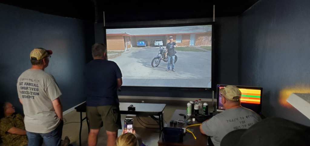 The afternoon’s lecture was spent on the capabilities of simulator training as relates to applying the cognitive model. Force on force training as a modality to reinforce anatomically correct targeting skills was also discussed. Then each student, with a partner to critique / coach them, had the opportunity to run a scenario on Meadhall’s Smokeless Range simulator, operated by Meadhall head honcho Bill Armstrong. Each student ran a unique scenario, and the instant feedback was invaluable.