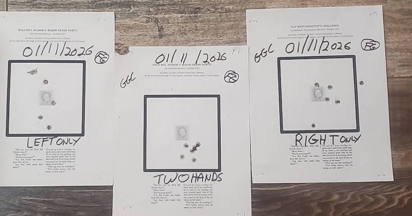 According to legend, Hickock emptied his revolvers daily by firing them, then cleaned and reloaded them. But he, apparently, also believed in shooting to measurable standards. Claude’s article documents a standard of what was “good shooting” to Hickock and one of his contemporaries, Major Frank North. Six shots fired with only one hand from “ten paces”, 25 feet give or take. The target was a five inch square envelope with a one inch postage stamp on it. To be considered “good” the shooter would have to land all their shots within the five inch square, with at least one touching the stamp. With no time limit it sounds easy, but can be deceptively difficult.