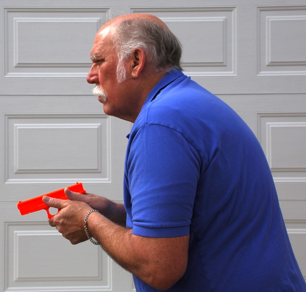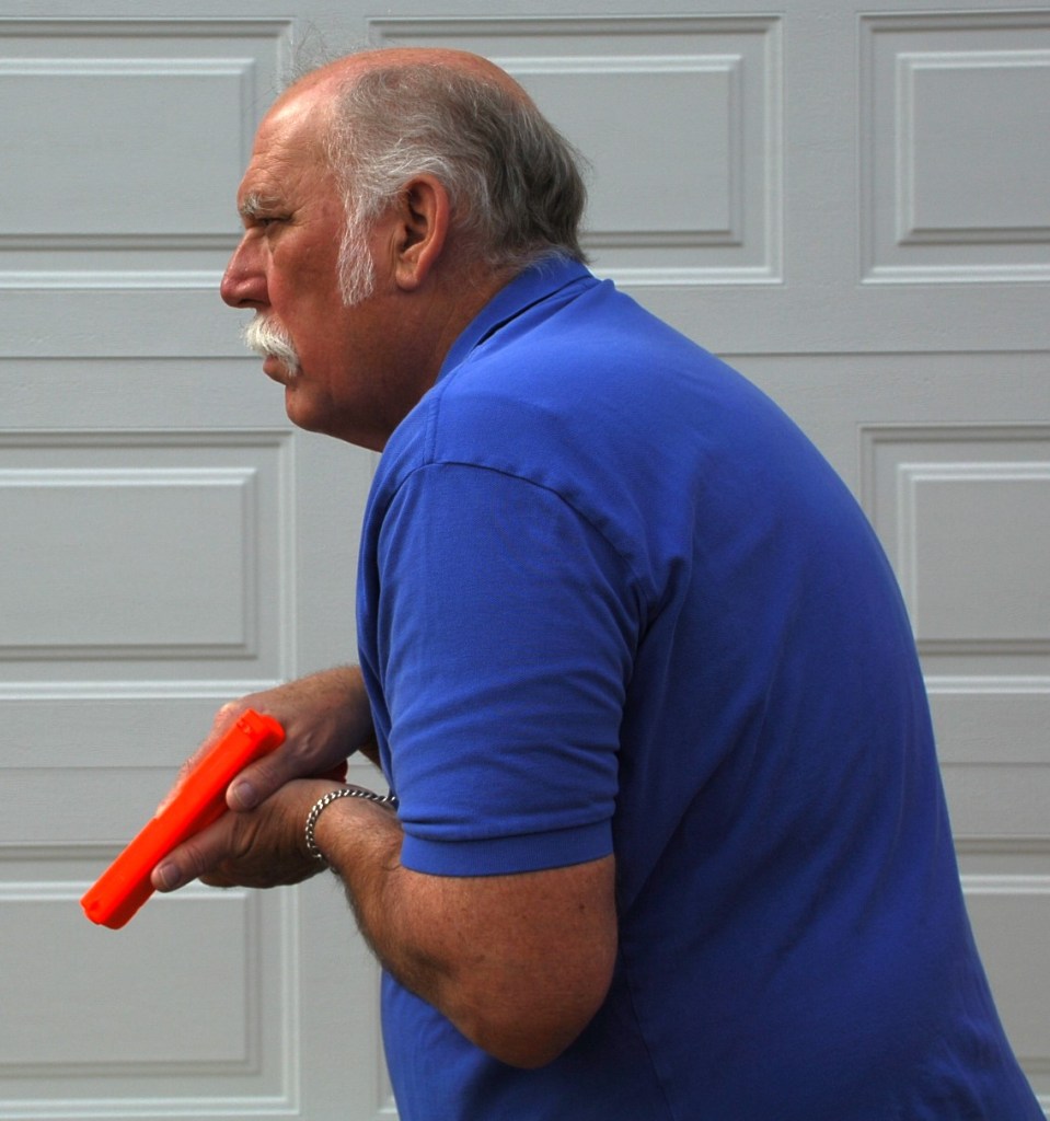 Low Ready – this position offers the widest range of use. No matter how near or how far I am from a threat, the muzzle is pointed at the ground at the feet of the threat. I can clearly visualize the threat from the waistline up. In this photo, I have placed a target seven yards away. The muzzle is aimed at the ground at the target’s feet. As the evidence from the Taylor study shows I can raise the gun to a firing position and begin pressing shots nearly as fast as I can with the muzzle held on the target’s torso.